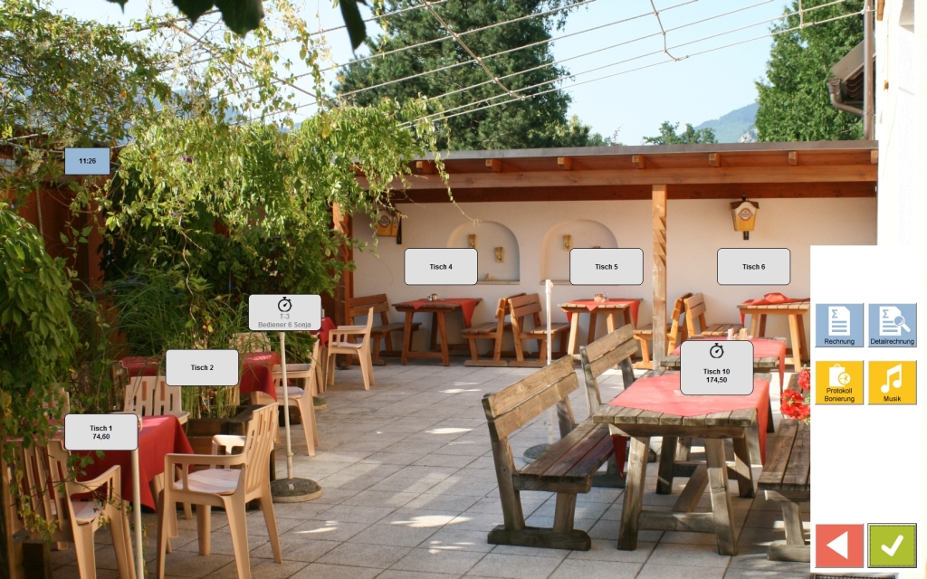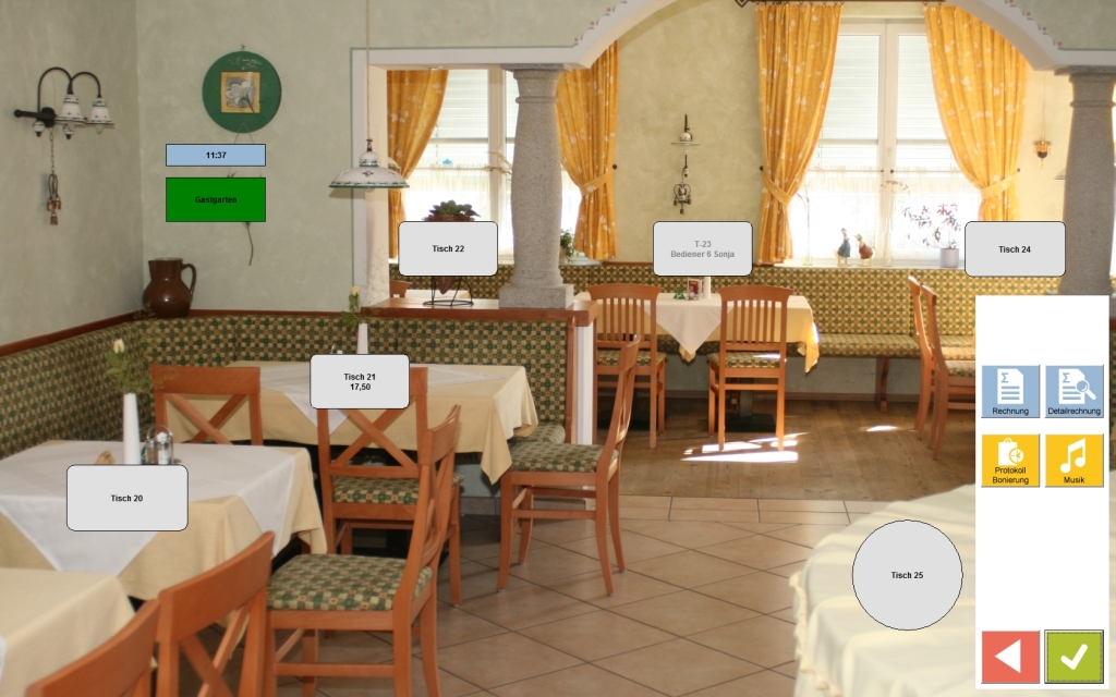 Mit der Tischplan-Funktion von Bonissimo werden alle Bonierstellen (Tische, Gäste, Zimmer) aufgelistet. Wählen Sie für jeden Raum einfach eine beliebige Hintergrundgrafik und legen Sie einzelne Tische in runder, ovaler, eckiger oder abgerundeter Form darüber. Offene Beträge werden hier ebenso angezeigt wie eine zeitgesteuerte Erinnerung für Tische, die länger nicht bedient wurden. Und sollte ein Gast den Tisch wechseln, verschieben Sie diesen auch am Tischplan einfach auf die neue Bonierstelle. Über den Tischplan können Sie auch direkt auf die Schnell- und Detailrechnung sowie auf das Tages- Bonierprotokoll zugreifen.